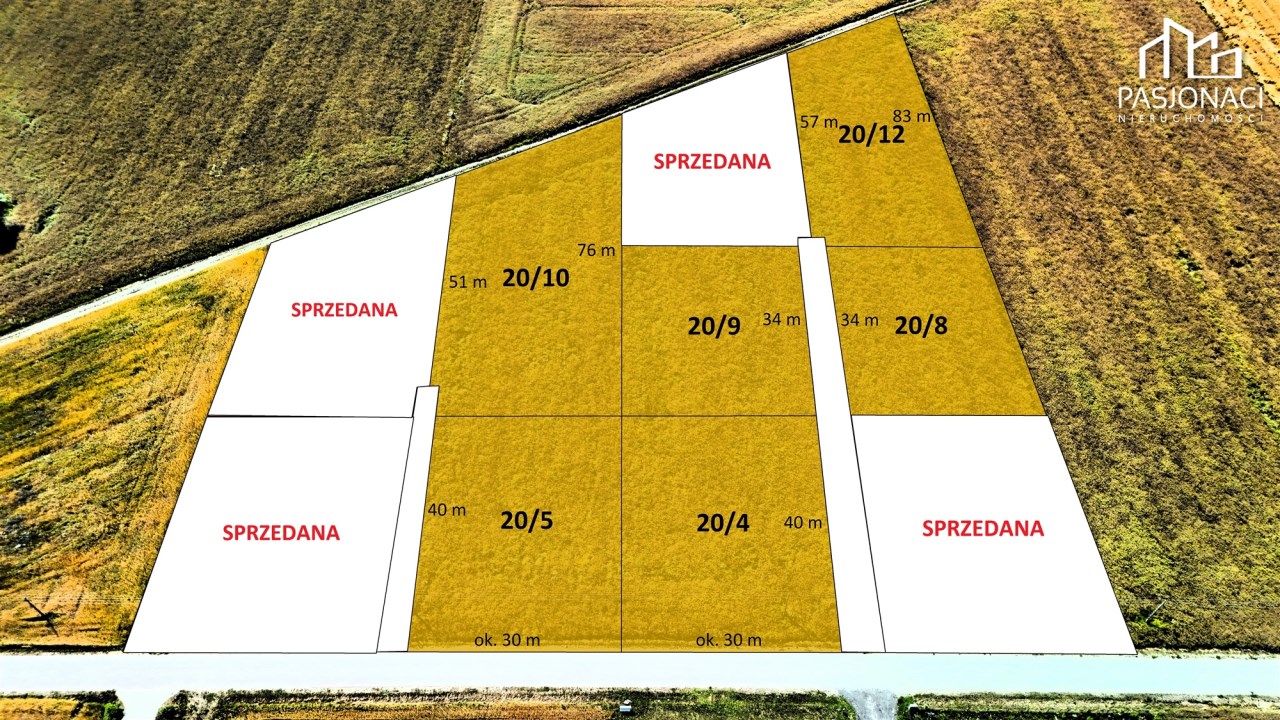 - Układ: działki w pierwszej, drugiej i trzeciej linii (dojazd od frontu drogą wewnętrzną lub z tyłu drogą polną)