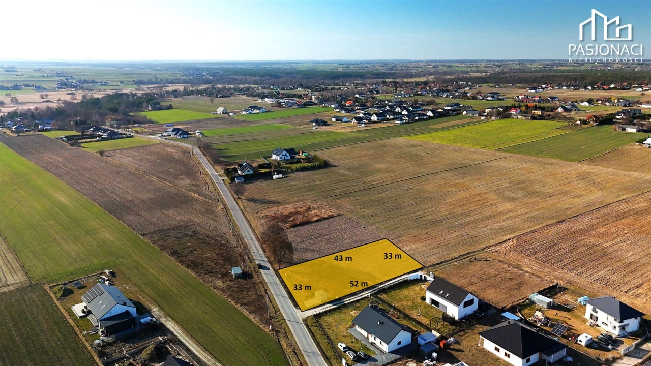 - Wymiary: 33 m x 52 m x 33 m x 43 m - działka o ustalanym kształcie trapezu